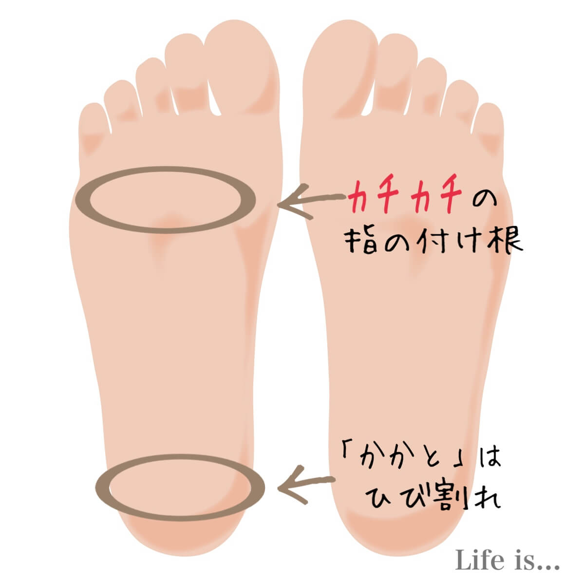 私の場合は、かかとのひび割れと足の指の付け根部分がカチカチになります。